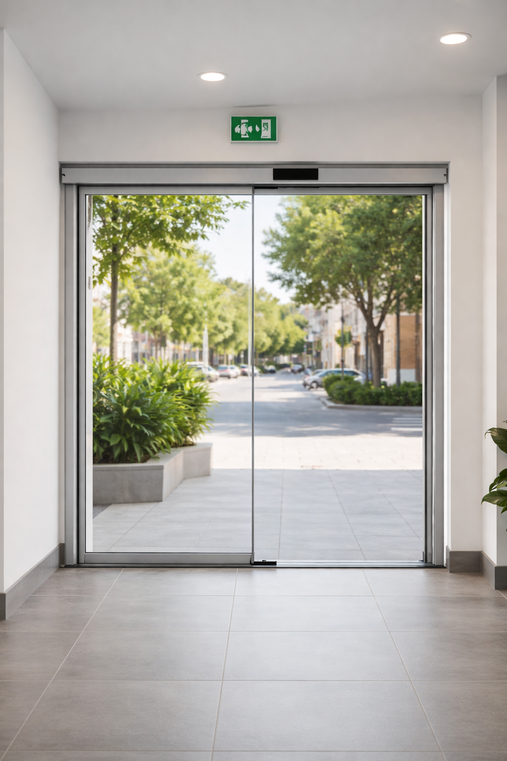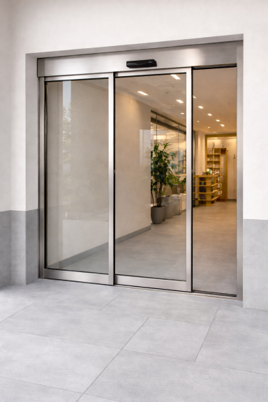 Porta generalment automàtica amb grans superfícies de vidre, molt usada en comerços i edificis públics perquè dona llum natural i una imatge oberta de l’interior.