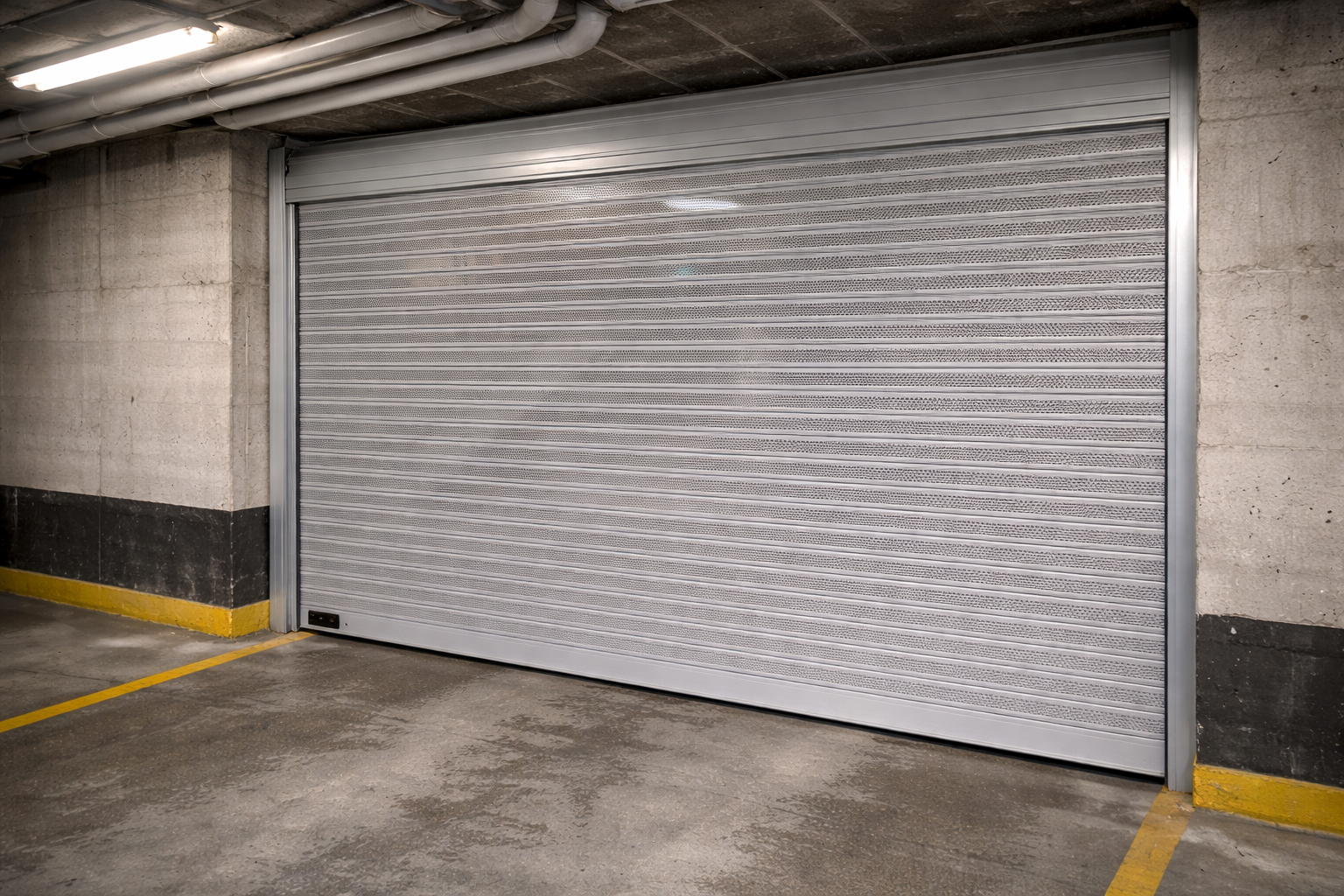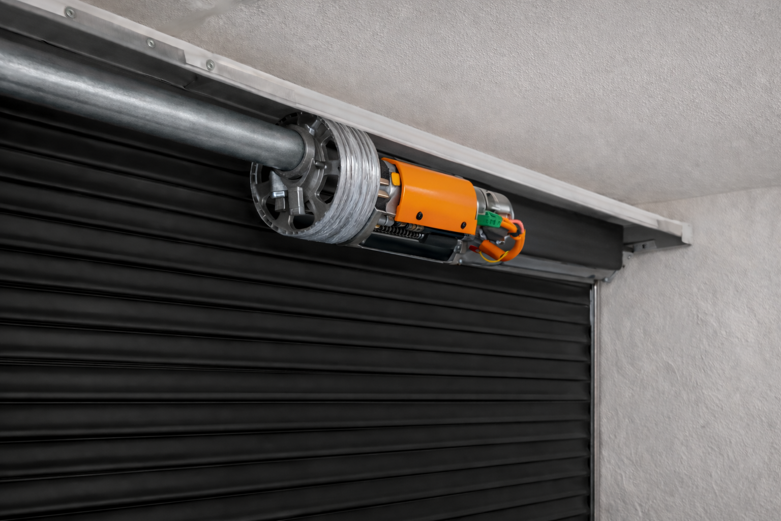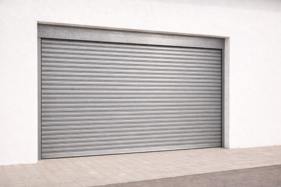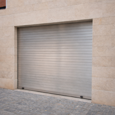 Porta composta per làmines de xapa d’acer galvanitzat que s’enrotllen sobre un eix.