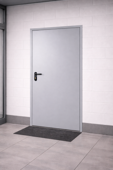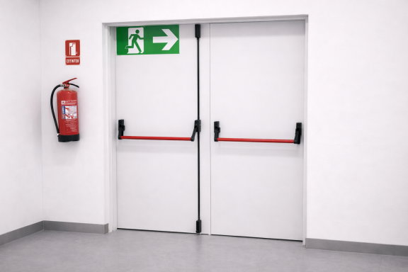 Porta de seguretat dissenyada principalment com a sortida d’emergència, certificada per resistir el foc i el pas de fum durant un temps determinat segons normativa vigent.