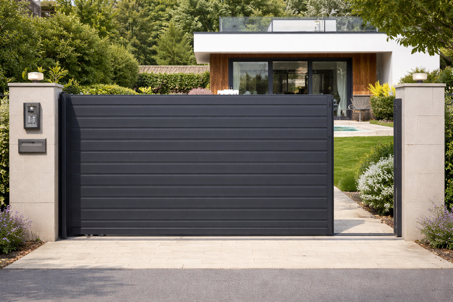 Porta que s’obre lliscant lateralment sobre una guia, molt pràctica per a entrades amples d’exteriors o indústries on es necessita deixar lliure tota l’amplada i alçada del pas.