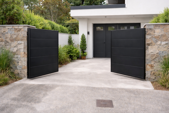 Porta amb una o dues fulles que s’obren girant sobre frontisses com una porta convencional, adequada per a accessos de vehicles o vianants en finques i indústries.